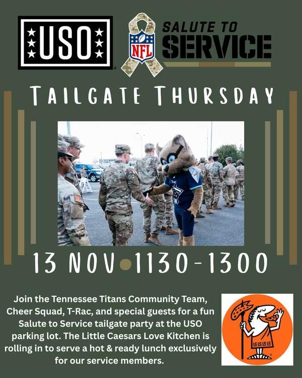 We’re serving up something special for our soldiers! The Little Caesars Love Kitchen is rolling in to provide free, fresh meals just for service members. Join us as the Tennessee Titans community team stops by with the Titans Cheer Squad, T-Rac, and a few surprise guests. It’s all part of the NFL’s Salute to Service, and it’s our way of saying thank you to those who serve. Come hungry and ready for some Titans fun!