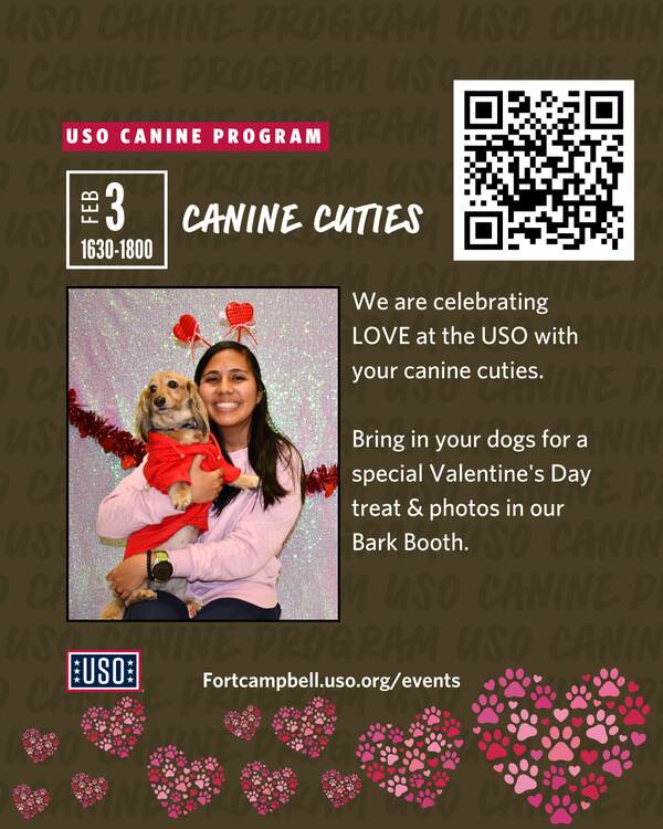 We are celebrating LOVE at the USO with your canine cuties. Bring in your dogs for a special Valentine’s Day treat & a chance to take some photos at our photobooth. You can arrive any time between 4:30 and 5:30 p.m. Please only register your four-legged friends. #USOCanine #USOHolidays #Valentines #Canine Cuties