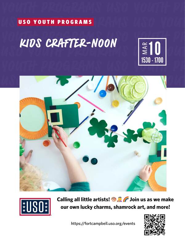 Calling all little artists! 🎨👩🎨 🌈 Join us as we make our own lucky charms, shamrock art, and more! 🍀🎉 It’s the perfect way to get into the St. Paddy’s Day spirit 💚Bring your creativity and spend a fun afternoon at the USO! Space is limited, and registration is required! Be sure to register each family member (over 2 years old) attending.